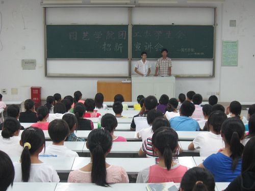 9月19日晚,園藝學院在8T07教室舉行2010級新生團工委學生會招新動員大會。園藝學院團工委學生會主席團及各部部長主持動員會并做了招新演講。園藝學院2010級的200余名新生參加了動員會。