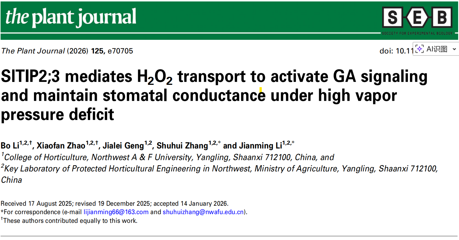 近日,園藝學(xué)院設(shè)施農(nóng)業(yè)生物與環(huán)境工程研究團(tuán)隊(duì)李建明教授/張淑輝副教授課題組在《The Plant Journal》在線發(fā)表題為“SlTIP2;3 mediates H2O2 transport to activate GA signaling and maintainstomatal conductance under high vapor pressure deficit”的研究論文,揭示了SlTIP2;3介導(dǎo)H2O2轉(zhuǎn)運(yùn)與GA信號級聯(lián)偶聯(lián),在VPD升高時(shí)觸發(fā)可塑性形態(tài)響應(yīng),從而協(xié)同提升Kplant,緩解氣孔導(dǎo)度隨VPD增加而下降的功能模型,深化了對植物響應(yīng)VPD升高的機(jī)制理解。