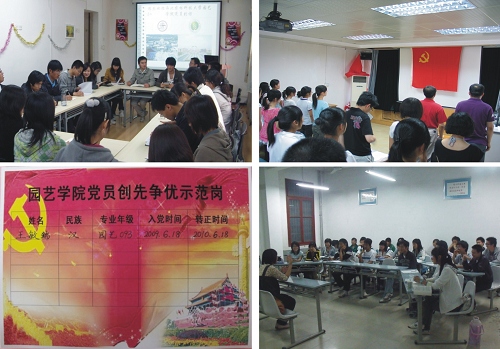 在此次黨員創(chuàng)先爭(zhēng)優(yōu)活動(dòng)中,園藝學(xué)院組織全院學(xué)生開展了一系列主題教育活動(dòng)來加強(qiáng)學(xué)生黨員隊(duì)伍建設(shè)和基層團(tuán)支部的凝聚力和戰(zhàn)斗力建設(shè),進(jìn)行“黨性教育活動(dòng)”,重溫入黨誓詞,堅(jiān)定黨員團(tuán)員的理想信念;開展“先進(jìn)團(tuán)支部經(jīng)驗(yàn)介紹會(huì)”,組織先進(jìn)團(tuán)支部與各團(tuán)支部進(jìn)行經(jīng)驗(yàn)交流,將本支部好的做法與各支部分享,發(fā)揮先進(jìn)團(tuán)支部的模范帶頭作用;進(jìn)行建立“黨員創(chuàng)先爭(zhēng)優(yōu)示范崗”,樹立黨員模范帶頭作用,在學(xué)生宿舍門外公開懸掛黨員創(chuàng)先爭(zhēng)優(yōu)示范崗標(biāo)牌,自覺接受同學(xué)們的監(jiān)督;開展“促學(xué)風(fēng),樹班風(fēng)”主題系列活動(dòng),邀請(qǐng)同學(xué)進(jìn)行學(xué)習(xí)經(jīng)驗(yàn)交流,給同學(xué)們營造一個(gè)奮發(fā)向上、銳意進(jìn)取、安全、文明、和諧的生活學(xué)習(xí)環(huán)境。