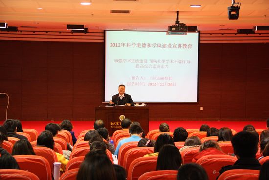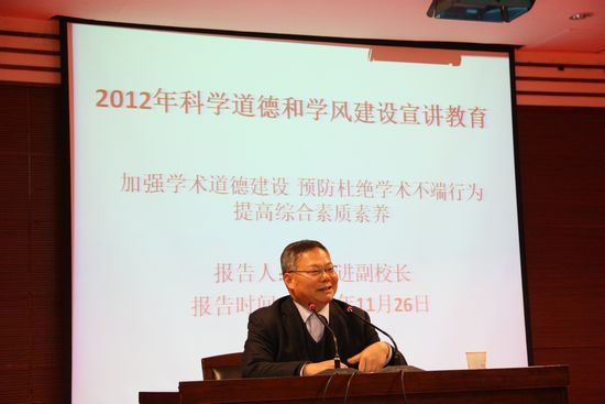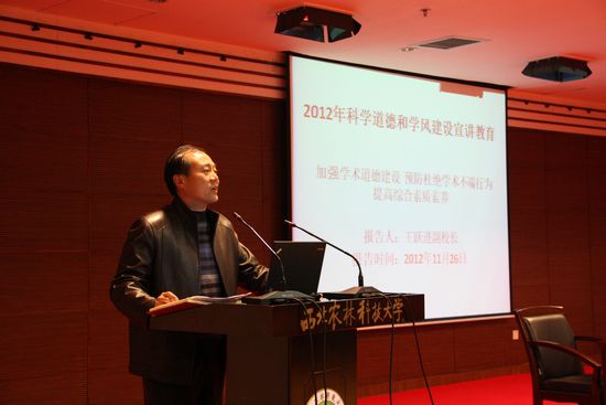 為深入貫徹落實(shí)中國(guó)科協(xié)、教育部、中國(guó)科學(xué)院、中國(guó)社會(huì)科學(xué)院、中國(guó)工程院《關(guān)于做好2012年科學(xué)道德和學(xué)風(fēng)建設(shè)宣講教育有關(guān)工作的通知》(科協(xié)發(fā)組【2012】16號(hào))文件精神,加強(qiáng)研究生科學(xué)道德和學(xué)風(fēng)建設(shè)宣講教育,11月26日晚,我院邀請(qǐng)陜西省科協(xié)副主席、陜西省園藝學(xué)會(huì)理事長(zhǎng)王躍進(jìn)在國(guó)際交流中心208會(huì)議室,為學(xué)院全體研究生及導(dǎo)師代表做了題為“加強(qiáng)科學(xué)道德建設(shè),預(yù)防杜絕學(xué)術(shù)不端行為,提高綜合素質(zhì)素養(yǎng)”的學(xué)術(shù)報(bào)告。報(bào)告會(huì)由學(xué)院黨委副書(shū)記李京春主持。